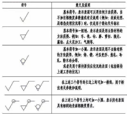 表示用加工面,其Ra值不得大于3.2um,由于推荐优先使用参数Ra,故“Ra”不注出。这是最常用的符号。