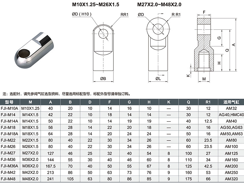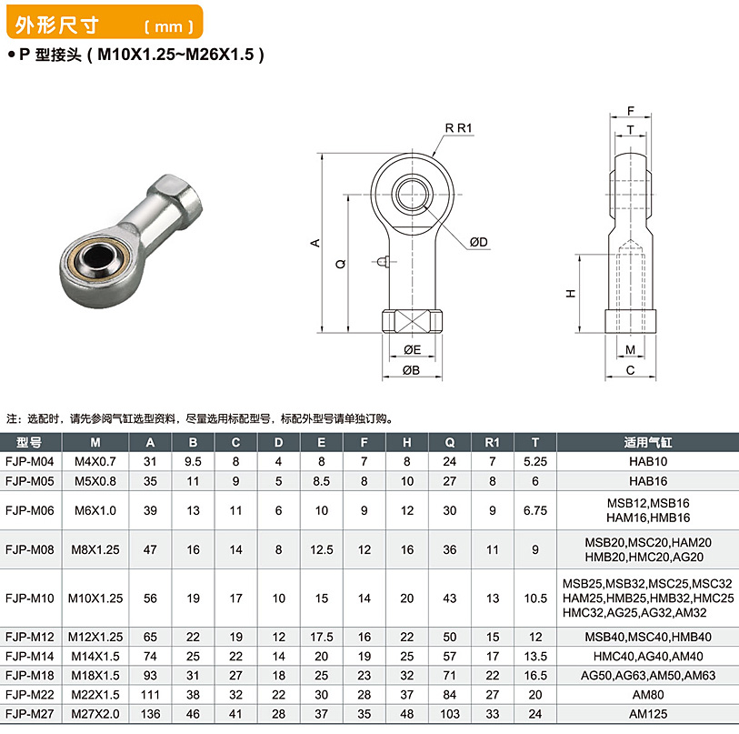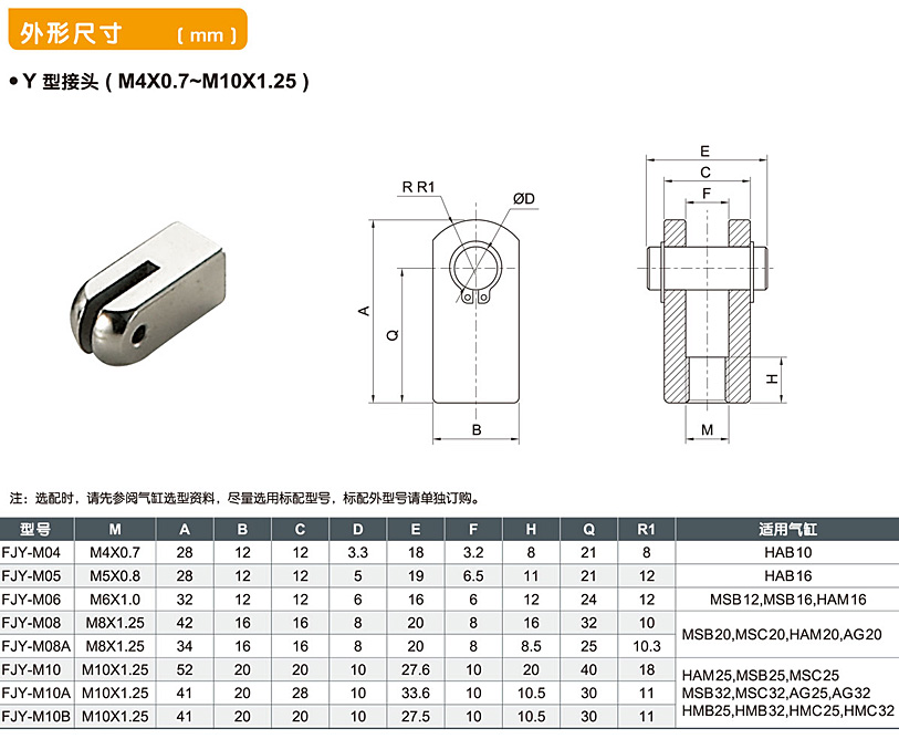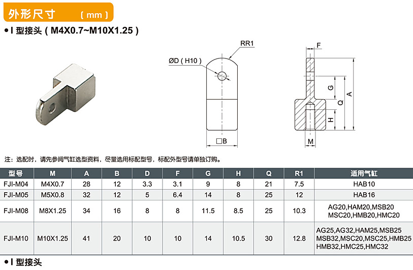 1. 类型丰富,按外形分为I 型接头、Y型接头、及P型接头。 2. 螺纹规格种类多,包含M4X0.7~M48X2.0,满足各规格气缸连接需求。 3. 选型方便,可根据使用要求,灵活配置。